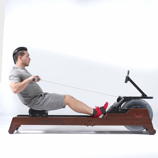 The Vertical Hydro Wooden Water Rowing Machine offers dynamic resistance and a water flywheel that automatically adjusts to individual strength and skill levels. Its vertically positioned water tank adds more resistance, and six water tank levels offer varying intensities. Its fixed foot plates and high seat clearance provide a smooth and efficient row, while its eco-friendly rubberwood material makes it an attractive addition to any home gym. The SunnyFit® app provides free, professional trainer-led workouts and progress tracking. With low-impact cardio design, it improves cardiovascular health and builds strength without undue stress on joints.